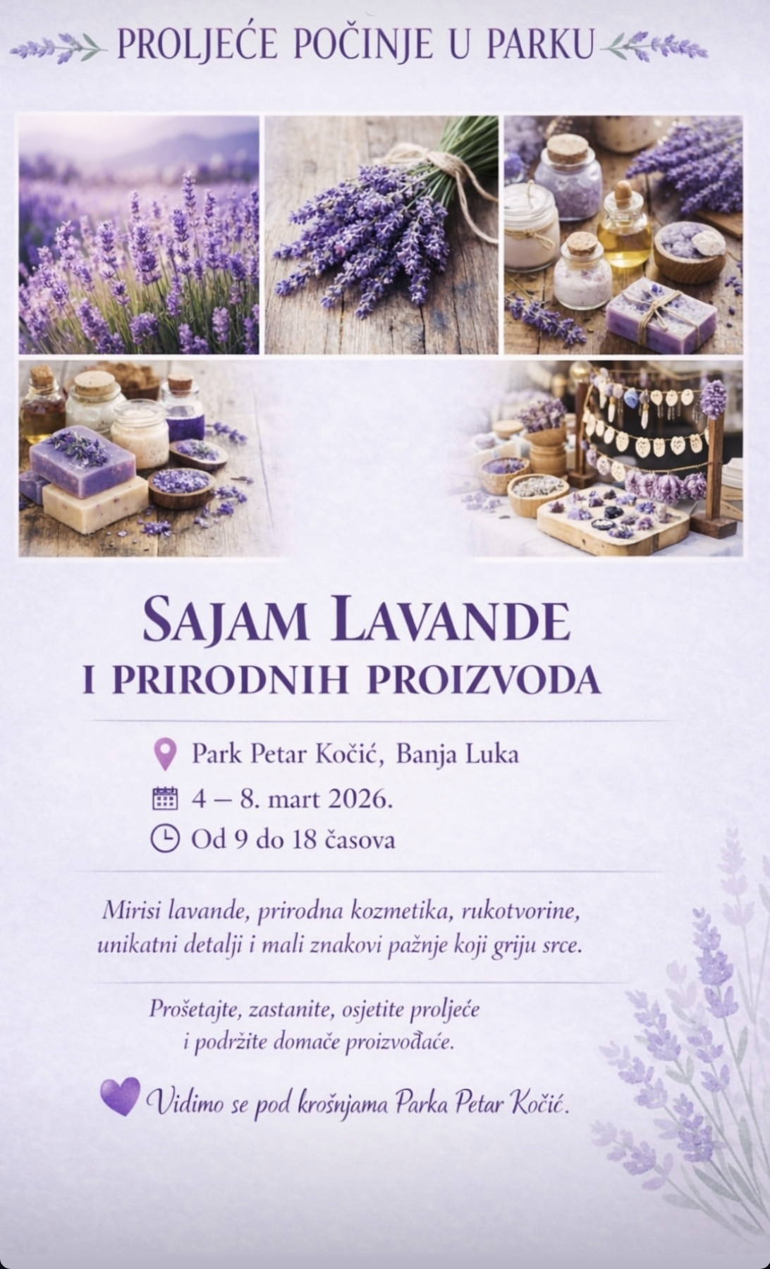 Organizatori pozivaju građane da iskoriste priliku za druženje i kupovinu autentičnih proizvoda, te da zajedno dočekaju proljeće – u bojama i mirisima lavande.