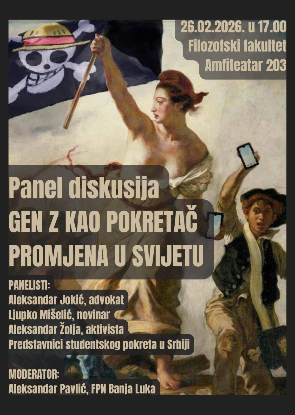 Zašto su pripadnici generacije Z postali pokretači društvenih promjena i na koji način se one odvijaju? To su ključna su pitanja na koje će pokušati da odgovori panel diskusija zakazana za 26. februar, na Filozofskom fakultetu u Banjaluci.