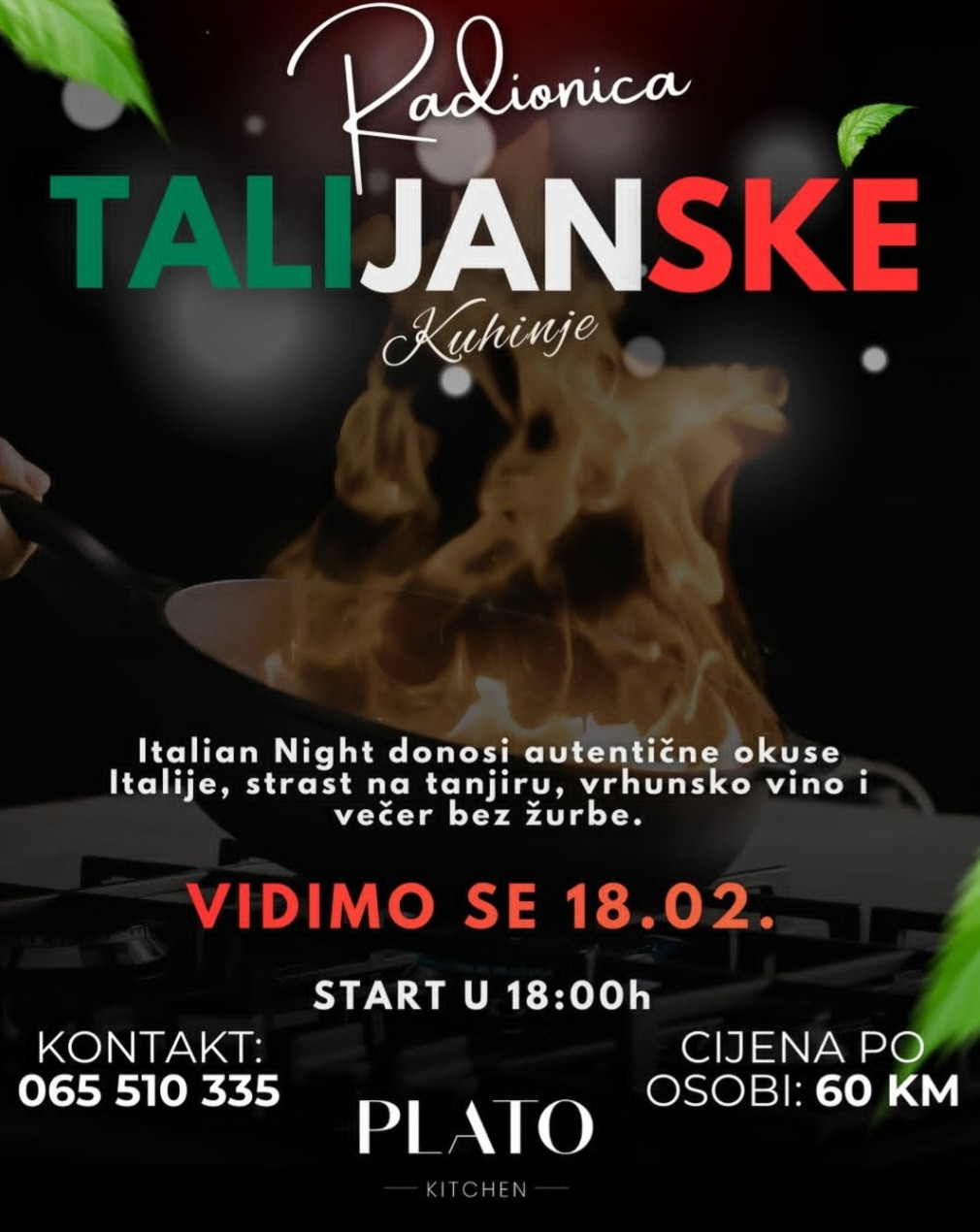 Restoran Plato Kitchen organizuje “Radionicu talijanske kuhinje” 18. februara, gdje će posjetioci moći uživati u večeri inspirisanoj tradicionalnim italijanskim receptima. Ovaj događaj, nazvan “Italian Night”, obećava jedinstveno kulinarsko iskustvo uz vrhunska vina i opuštenu atmosferu bez žurbe.