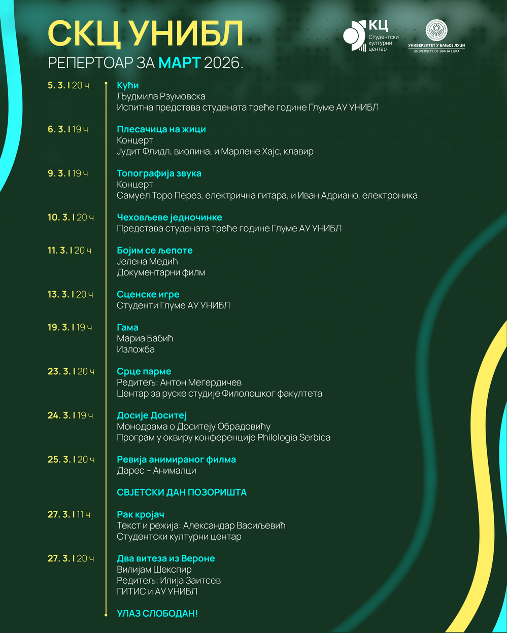 Repertoar za mart 2026. godine u Studentskom kulturnom centru banjalučkog Univerziteta donosi bogat program pozorišnih predstava, koncerata, izložbi i filmskih projekcija.