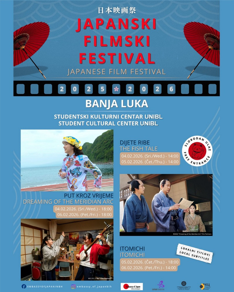 Najveći grad Republike Srpske će početkom februara biti domaćin Japanskog filmskog festivala, koji će se od 4. do 6. februara 2026. godine održati u prostoru Studentskog kulturnog centra Univerziteta u Banjaluci.
