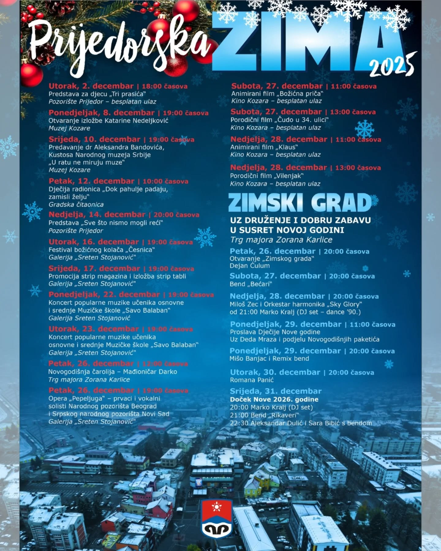 Bogatim i raznovrsnim sadržajima Prijedor i ove godine potvrđuje status jednog od najživljih gradova tokom zimskih praznika, nudeći sve – od kulturnih programa i koncerata, do porodičnih filmskih projekcija i zabave na otvorenom.